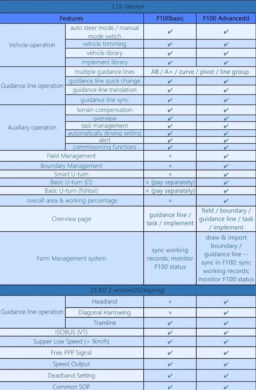 Sveaverken F100 Auto-steer System comparison data between Basic & Advanced