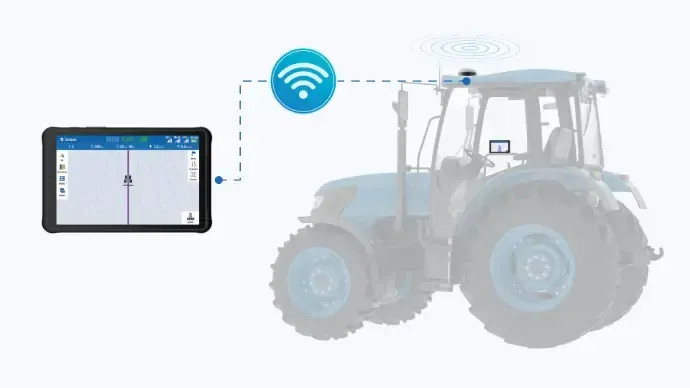 The F100G guide terminal communicates with the GNSS receiver via Wi-Fi, which means one less wire to connect the tractor to the cab from the roof.